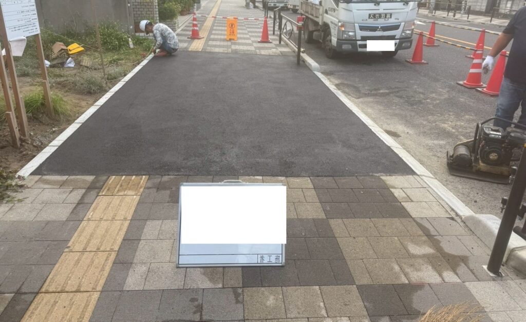 9月25日(木)墨田区にて歩車ブロック6m切り下げ、アスファルト舗装、ガードパイプ撤去、境界ブロック新設工事にお伺い致しました。